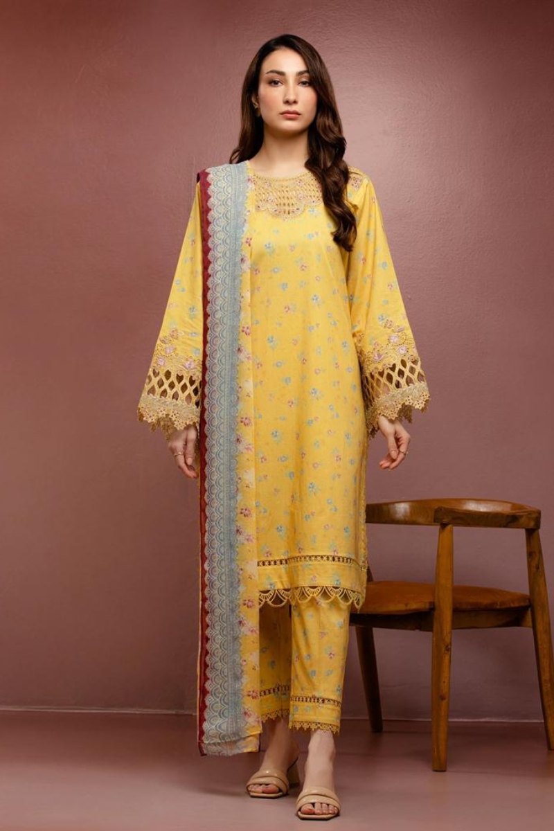 EDENROBE ORIGINAL -Embrace timeless elegance in this printed Cambric set, where the delicate fabric is adorned with beautiful organza embroidery. The matching printed trousers and airy chiffon dupatta create a perfectly unified and feminine outfit.