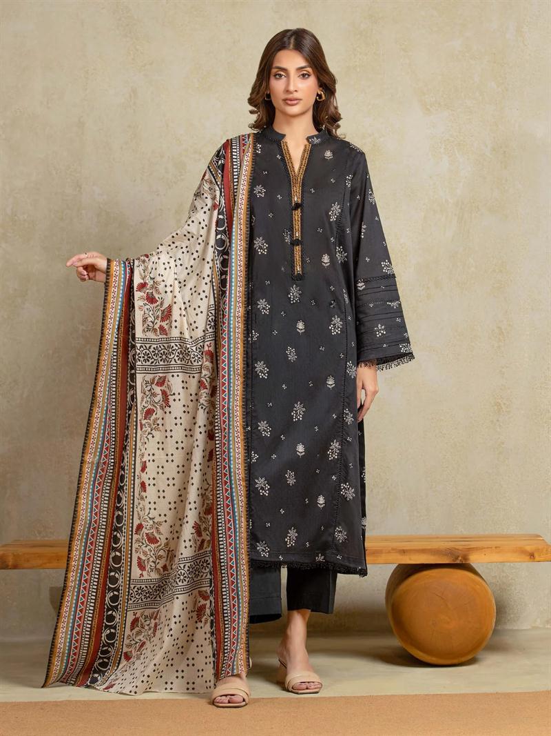 EDENROBE ORIGINAL - A contemporary 3 PCS khaddar ensemble with printed Khaddar shirt with embellishment on sleeves. The dyed trousers and lightweight khaddar dupatta complete this modern look