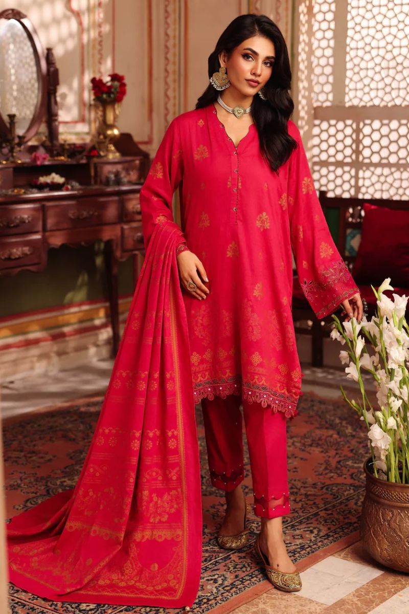 EDENROBE ORIGINAL - Shirt – Printed Jacquard Shirt with Embellishment & Schiffli Embroidery on Sleeves and Embellished Lace on Daman. Trouser – Plain Cambric Trouser with Embellishment and Organza on Bottom. Dupatta - Floral Jacquard Printed Dupatta with Tassels.