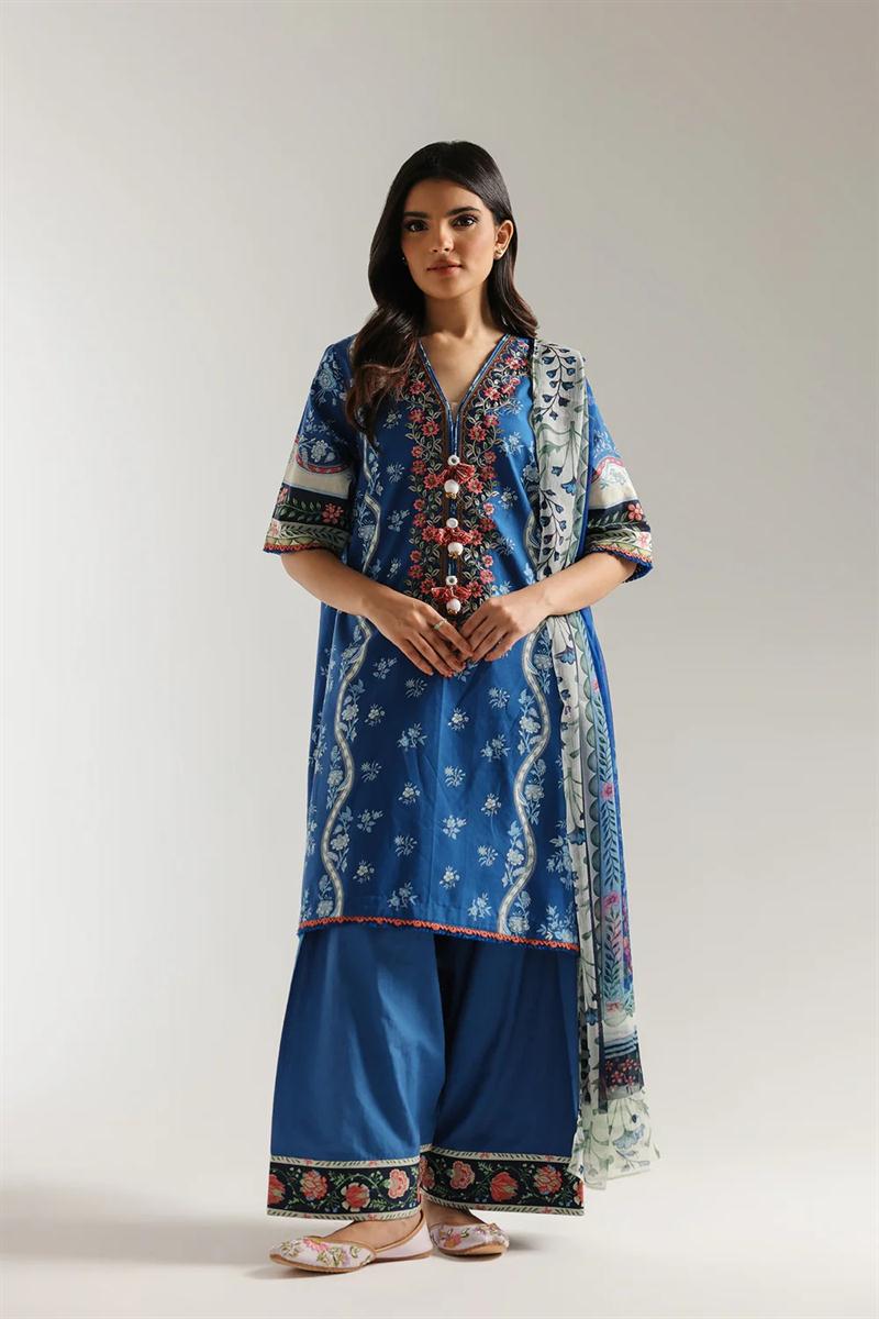 ETHNC ORIGINAL- Featuring intricate embroidery on the winter cotton shirt and a matching dyed winter cotton trouser. Completed with an printed Chiffon dupatta