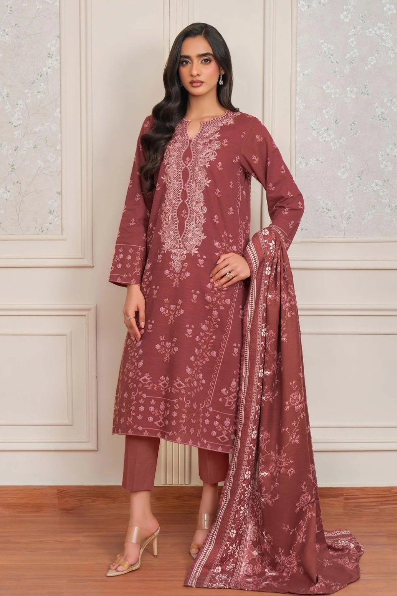 LIMELIGHT ORIGINAL- A stylish ensemble featuring a embroidered khaddar shirt paired with printed khaddar trousers and printed shawl. Stitched in same pattern as seen in pictures)