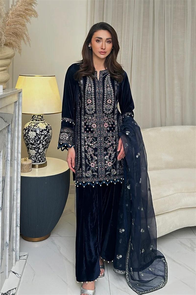 SAPPHIRE ORIGINAL - Luxurious three-piece navy blue velvet suit. Features an embroidered velvet shirt and trousers, paired with a sheer embroidered organza dupatta. Rich texture, intricate details, and elegant drape for a standout occasion look.