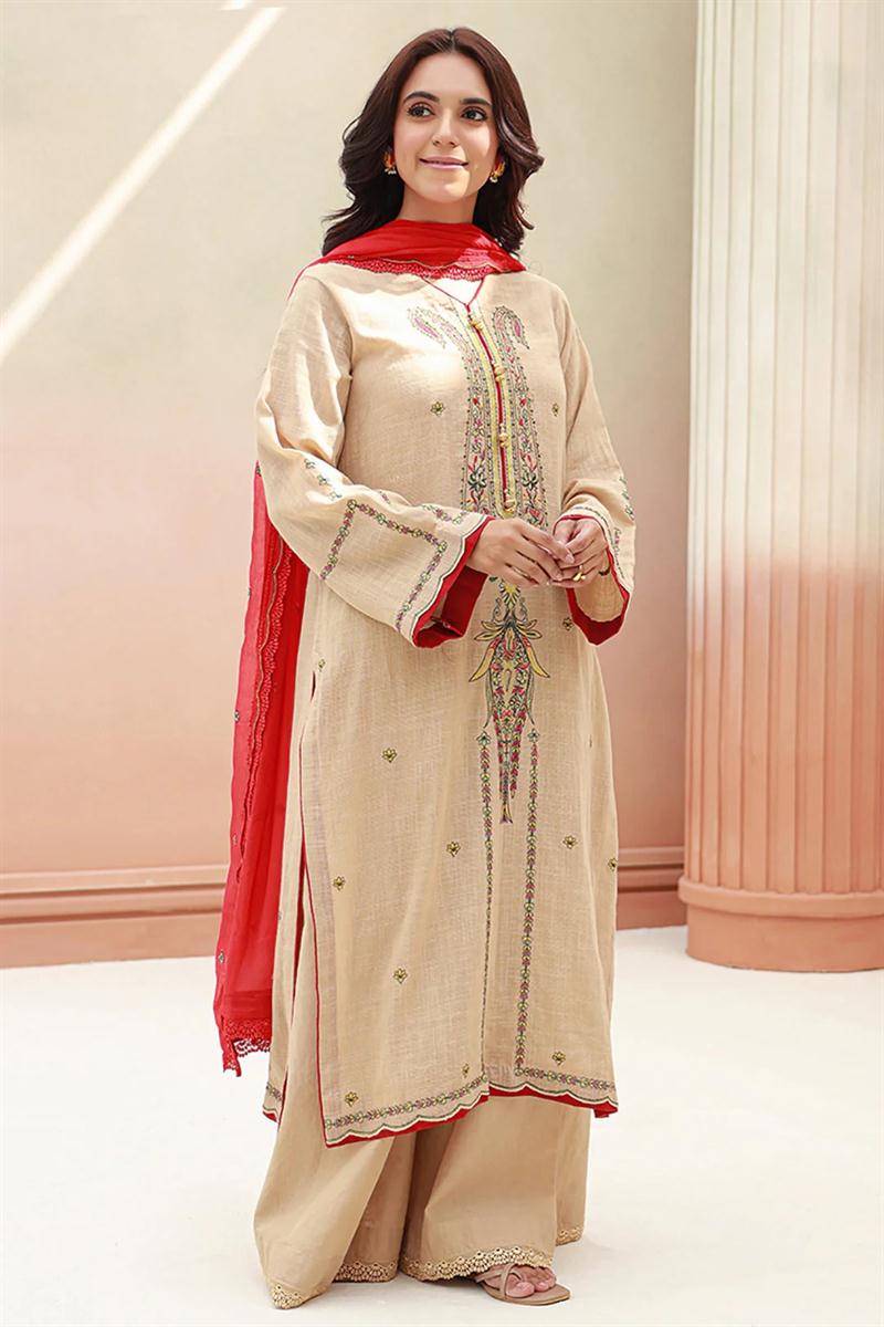 ZELLBURY ORIGINAL - Make a statement with our 3-piece embroidered suit ensemble featuring a embroidered slub shirt paired with cambric trouser & embroidered pashmina shawl