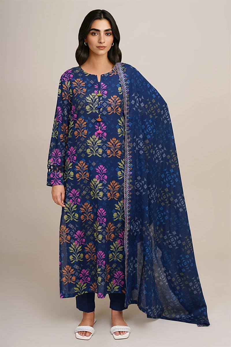 KAYSERIA ORIGINAL - As deep as the night sky, this navy suit holds a universe of detail. Woven from the earthy threads of Khaddar, it tells a story of contrast—where a printed foundation meets the delicate art of embroidery on a flowing dupatta. Fully stitched to perfection, it’s an ensemble for the woman who finds her power in tradition and expresses it with quiet, unwavering confidence.
