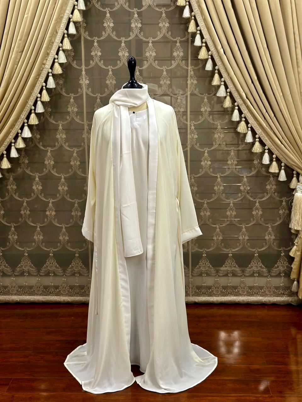 A flare abaya with a scarf, open abaya, and inner is a sophisticated and modern take on traditional Islamic wear. It combines modesty, comfort, and style, perfect for a variety of occasions, whether casual or formal. This design focuses on a flowing, feminine silhouette while maintaining the cultural significance of modesty.