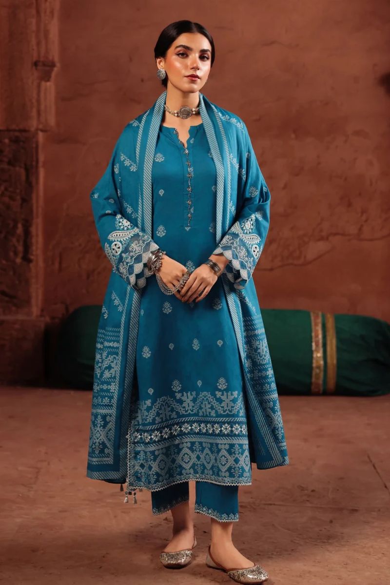EDENROBE ORIGINAL - Shirt – Shirt – Floral Jacquard Printed Shirt with Embroidered Placket, Sleeves, and Daman. Trouser - Plain Cambric Trouser with Embroidery on Bottom. Dupatta - Printed Jacquad Embellished Dupatta