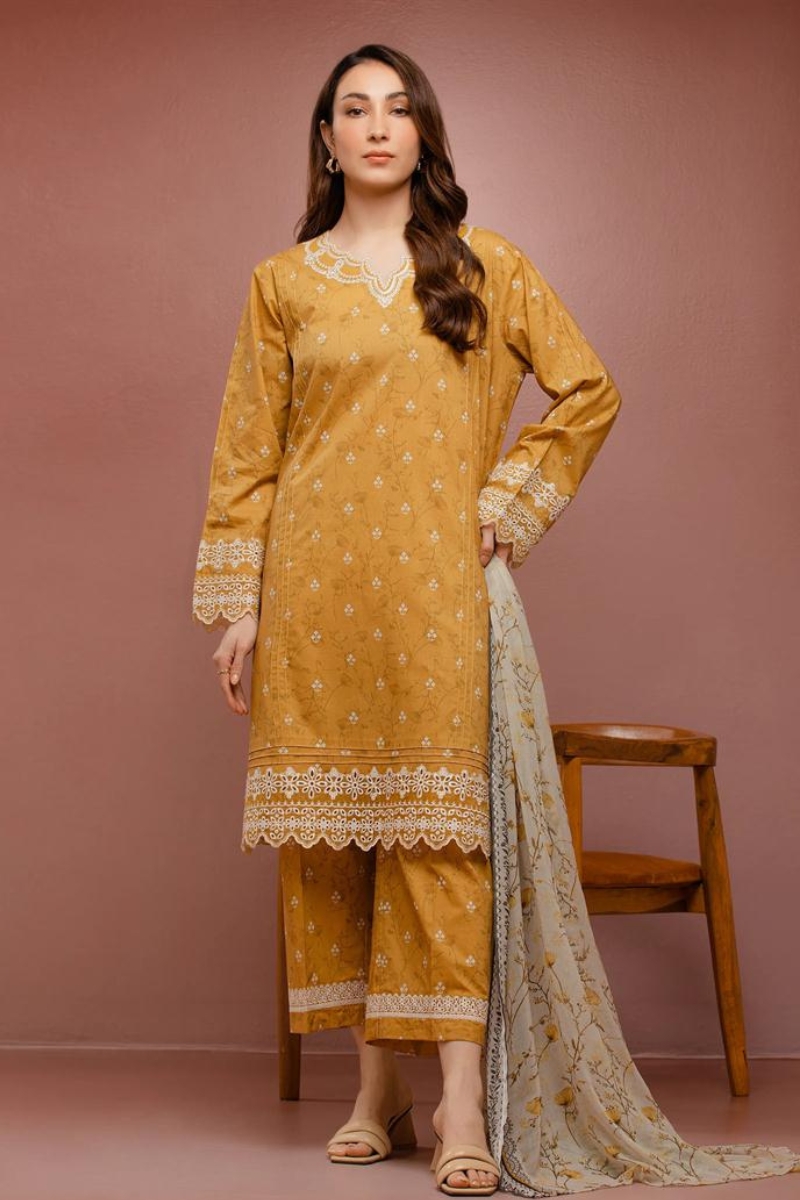 EDENROBE ORIGINAL A beautifully coordinated set featuring a printed Cambric shirt and trousers, meticulously detailed with organza embroidery and lace. The outfit is finished with a graceful chiffon dupatta for a perfectly polished and feminine look.