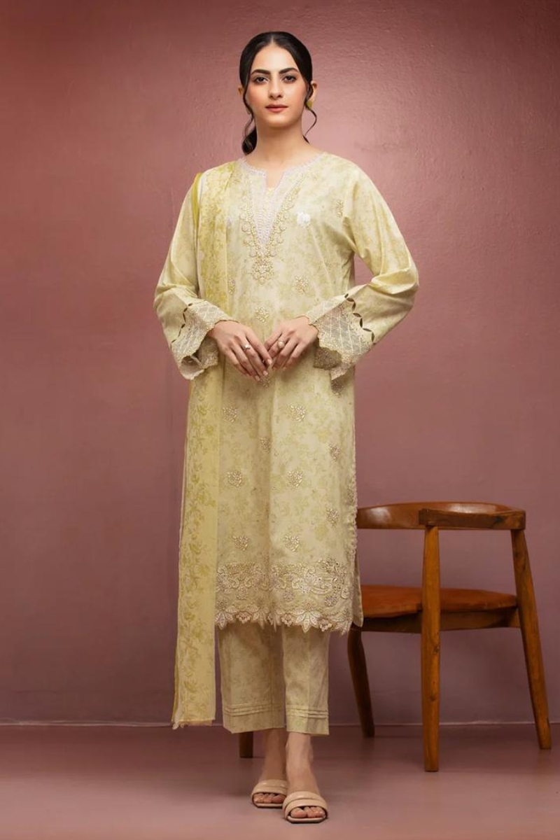 EDENROBE ORIGINAL - A modern masterpiece featuring a beautifully contrasted Cambric shirt with intricate embroidery and a printed back. The look is completed with matching printed trousers and a soft chiffon dupatta for a touch of effortless grace.