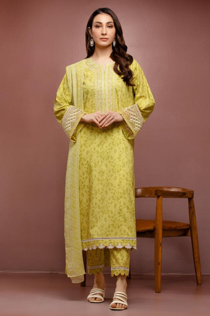 EDENROBE ORIGINAL -A perfectly coordinated ensemble where the printed Cambric shirt and trousers create a harmonious silhouette, elevated by intricate organza borders. The lightweight printed chiffon dupatta adds an ethereal finish to this polished look.