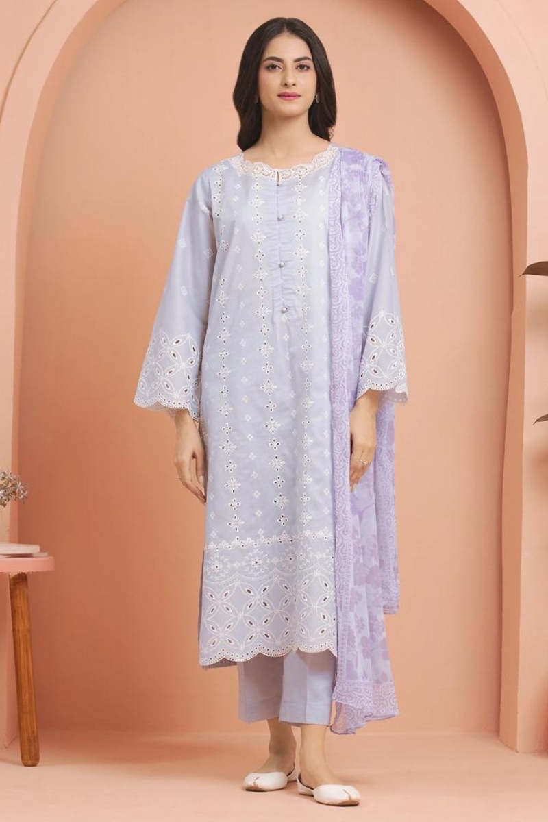 EDENROBE ORIGINAL - A contemporary ensemble featuring a beautifully contrasted Cambric shirt with rich embroidery and a sleek dyed back. The dyed trousers and printed chiffon dupatta complete this look of sophisticated, structured elegance.