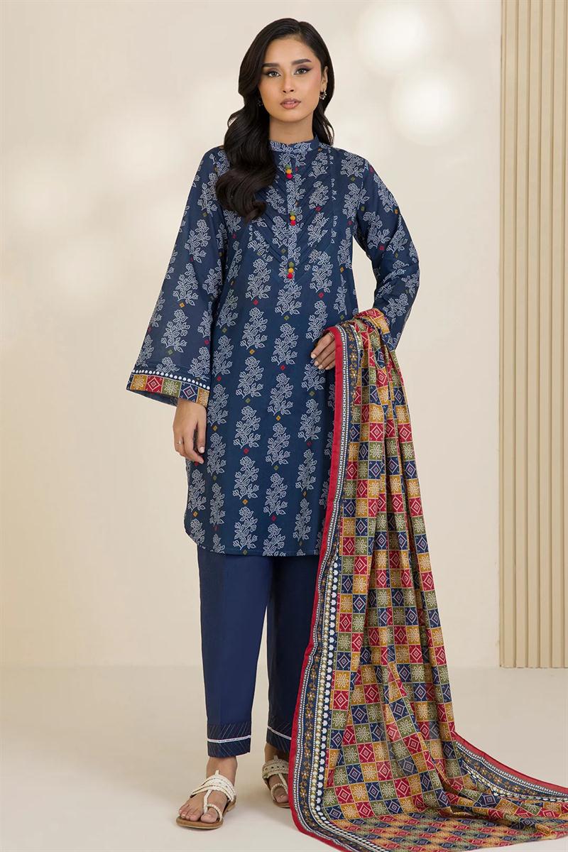 ZELLBURY ORIGINAL - This elegant cotton suit features printed shirt with embellished sleeves. Paired with dyed trousers and printed cotton dupatta