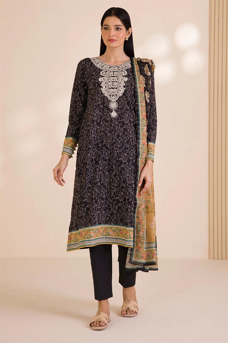 ZELLBURY ORIGINAL - This elegant cotton suit features embroidered shirt with printed sleeves. Paired with dyed trousers and printed lawn dupatta