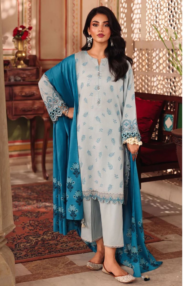 EDENROBE ORIGINAL - SHIRT - Printed Jacquard Shirt with Embellished Placket, Organza-Trimmed Embroidered Sleeves, Lace-Trimmed Daman, and Embroidered Chalk. TROUSER – Plain Cambric Trouser with Ogranza Trimmed Lace on Bottom. Dupatta - Floral Printed Jacquard Dupatta with Tassels