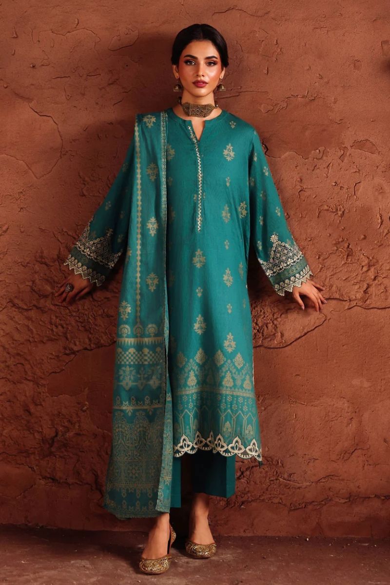EDENROBE ORIGINAL - SHIRT - Floral Jacquard Printed Shirt with Embroidered Placket, Sleeves, Chalk, & Daman. TROUSER – Plain Cambric Trouser. DUPATTA – Printed Jacquard Dupatta