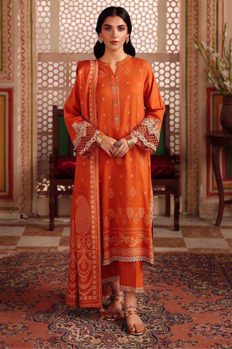 EDENROBE ORIGINAL - Shirt – Printed Jacquard Shirt with Embellishment on Placket & Embroidered Sleeves. Trouser - Plain cambric Trouser with Embroidery on Bottom. Dupatta – Printed Jacquard Dupatta