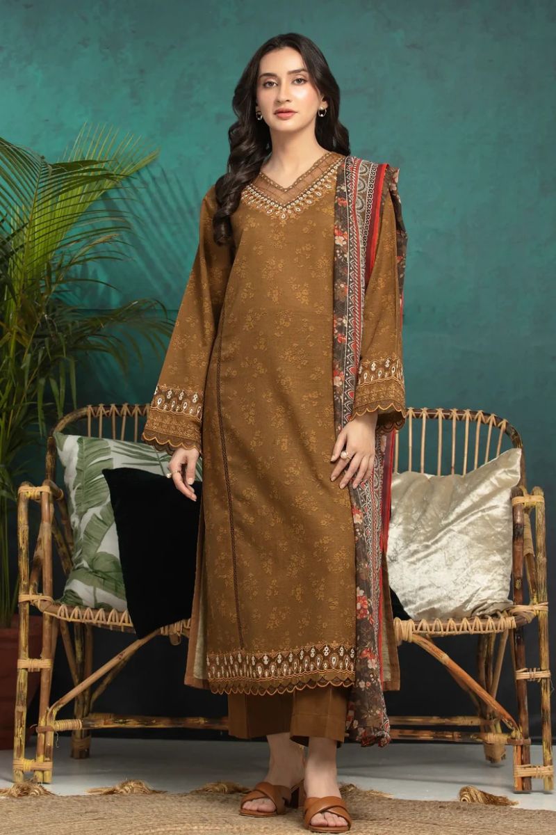 EDENROBE ORIGINAL - This exquisite 3-piece stitched suit is crafted from comfortable Khaddar fabric. The printed Khaddar kameez features delicate organza embroidery along the neckline, sleeves, and daman (hem). It is paired with a dyed Khaddar trouser and a graceful printed chiffon dupatta, creating a perfect blend of traditional charm and modern elegance