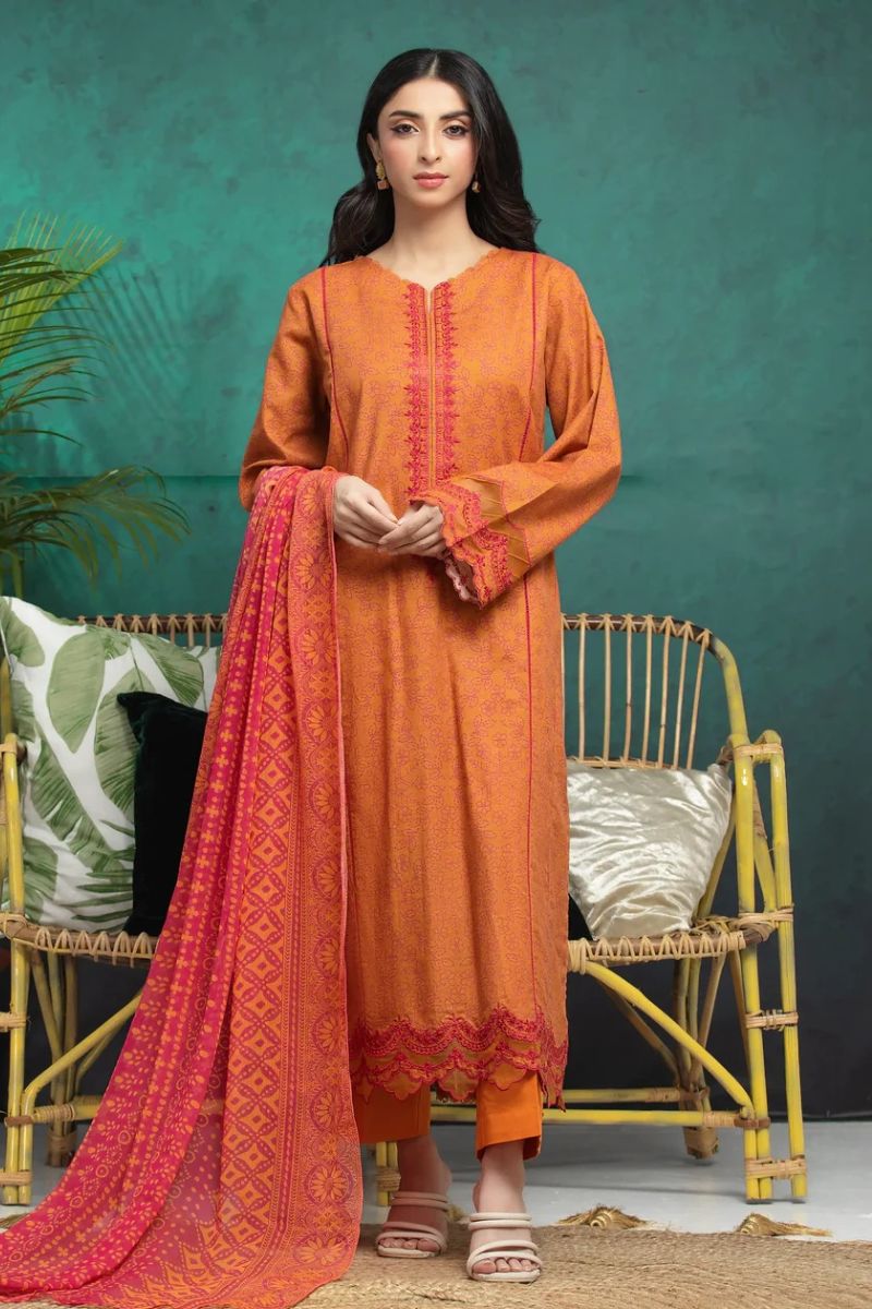 EDENROBE ORIGINAL - Khaddar three-piece suit. Featuring opulent embroidery on the front and back. The look is balanced with a delicate organza neckline, fully embroidered sleeves, and a sleek dyed khaddar trouser. The beautiful printed chiffon dupatta adds the final touch of effortless elegance.