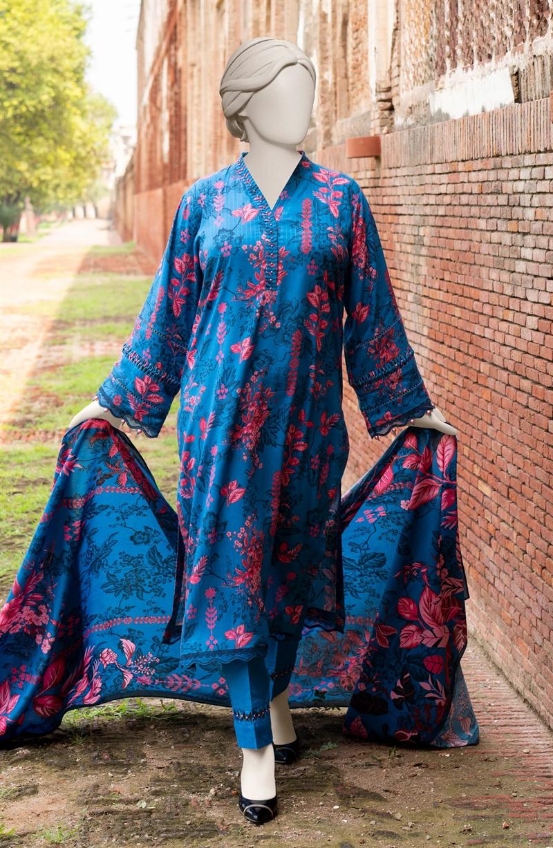 MTJ ORIGINAL - 3-piece suit crafted from premium winter khaddar suit. The Printed khaddar shirt is elegantly detailed with digital print It is paired with lightweight khaddar trousers for comfort and a striking khaddar shawl
