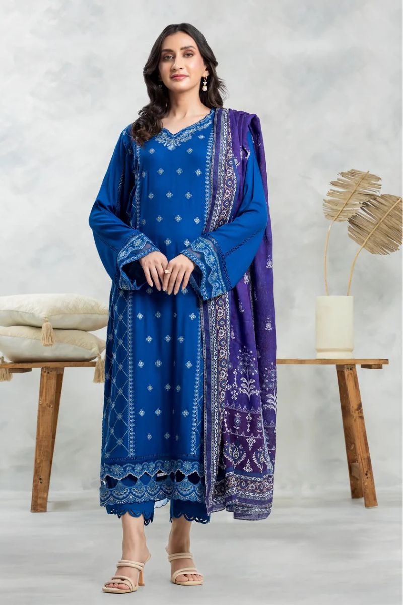 EDENROBE ORIGINAL -A stylish viscose suit set featuring an embroidered front and sleeves. The design includes an embroidered organza neckline and an embroidered border at the daman. The ensemble is completed with a full printed shawl and matching dyed viscose trousers